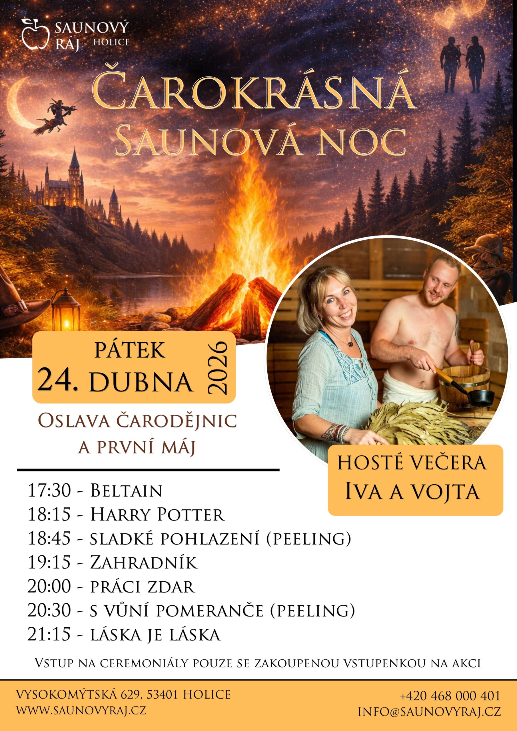 Připravte se na večer plný vůní, tepla a tajemné atmosféry. V pátek 24. dubna vás zveme na jedinečnou Čarokrásnou saunovou noc, která propojí tradiční saunové rituály s magií Beltainu, oslavami čarodějnic i příchodem prvního máje.