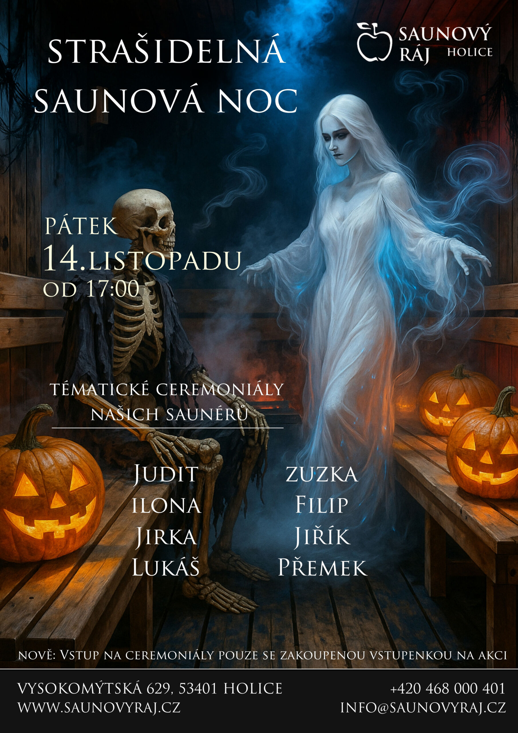 Zveme vás na Strašidelnou saunovou noc, která se uskuteční v pátek 14. listopadu 2025 v Saunovém ráji Holice.